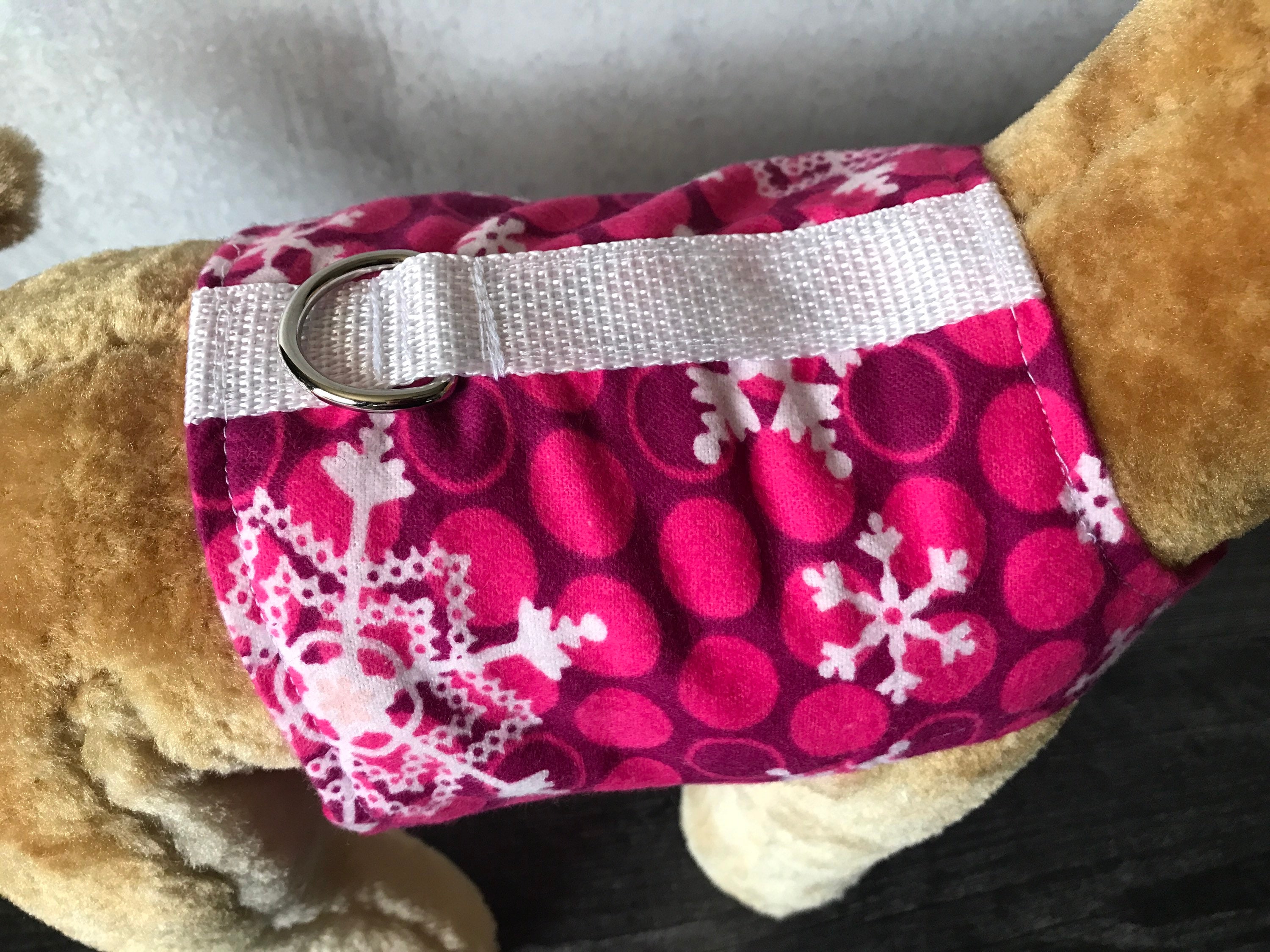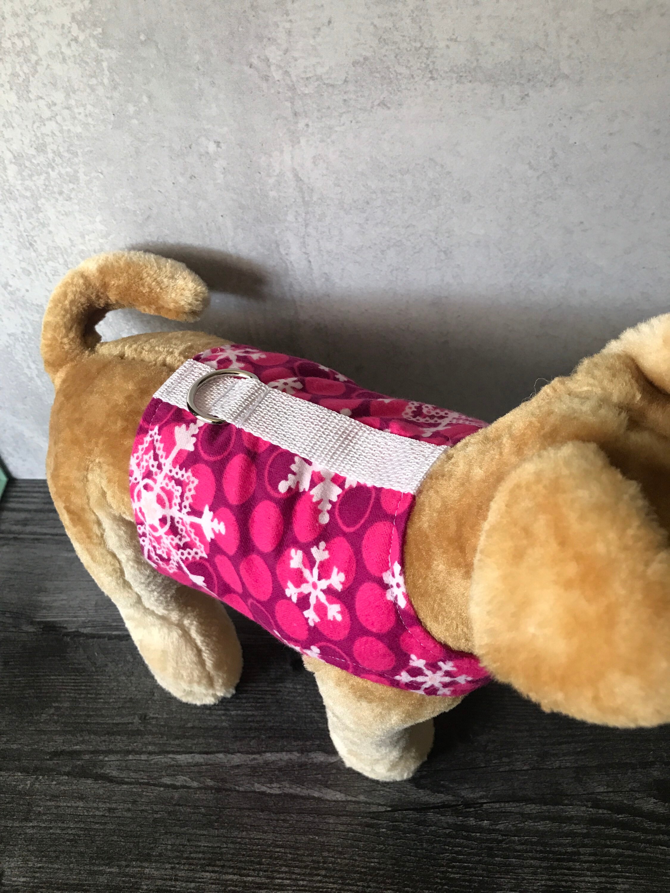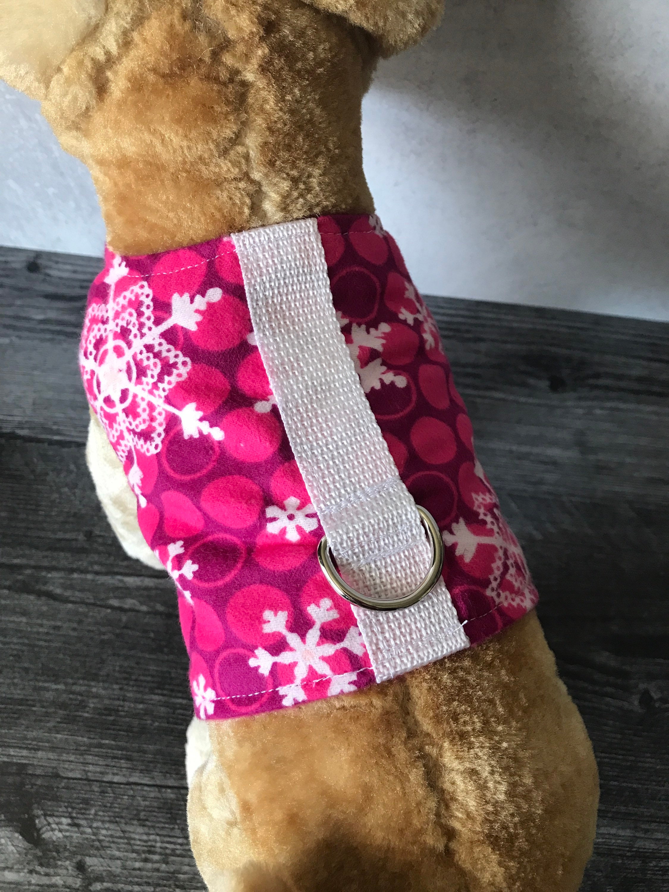 Your pup will be styling in this fun harness vest. This very stylish & comfy Handmade Dog Harness Vest is made of the softest quality flannel lining and flannel exterior. It features a wrap around collar and D Ring. Fastens with velcro at neck and under belly. This harness is also suitable for cats. These harnesses are designed for smaller dogs.