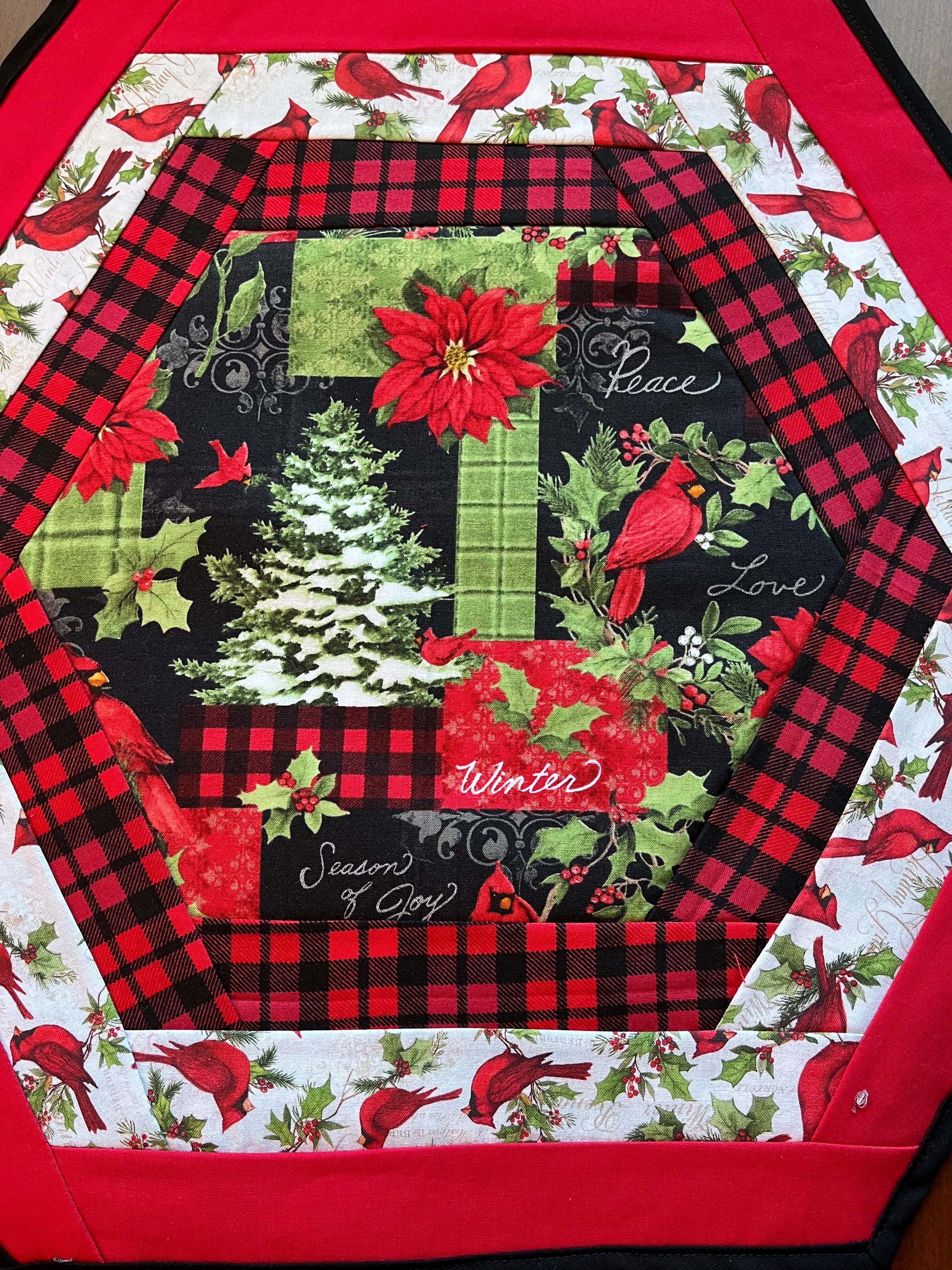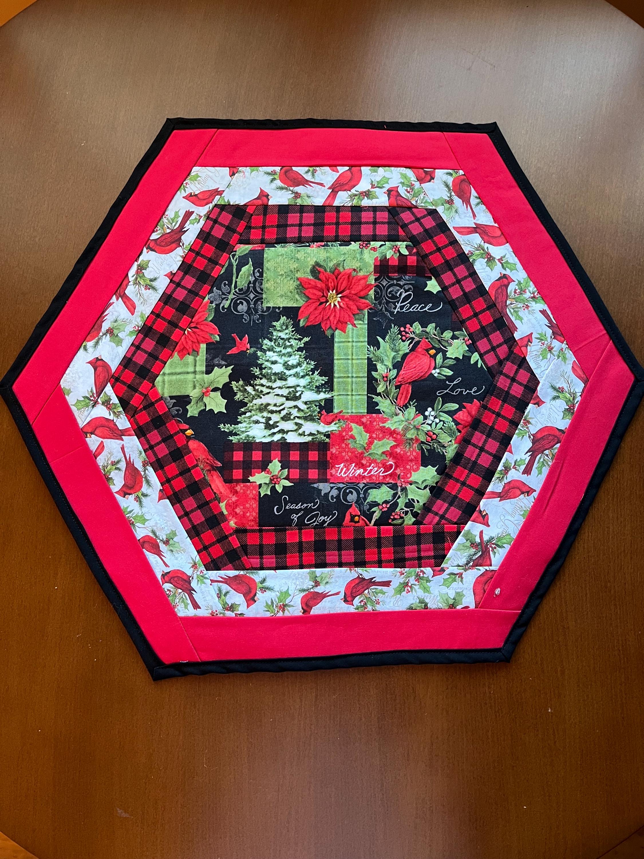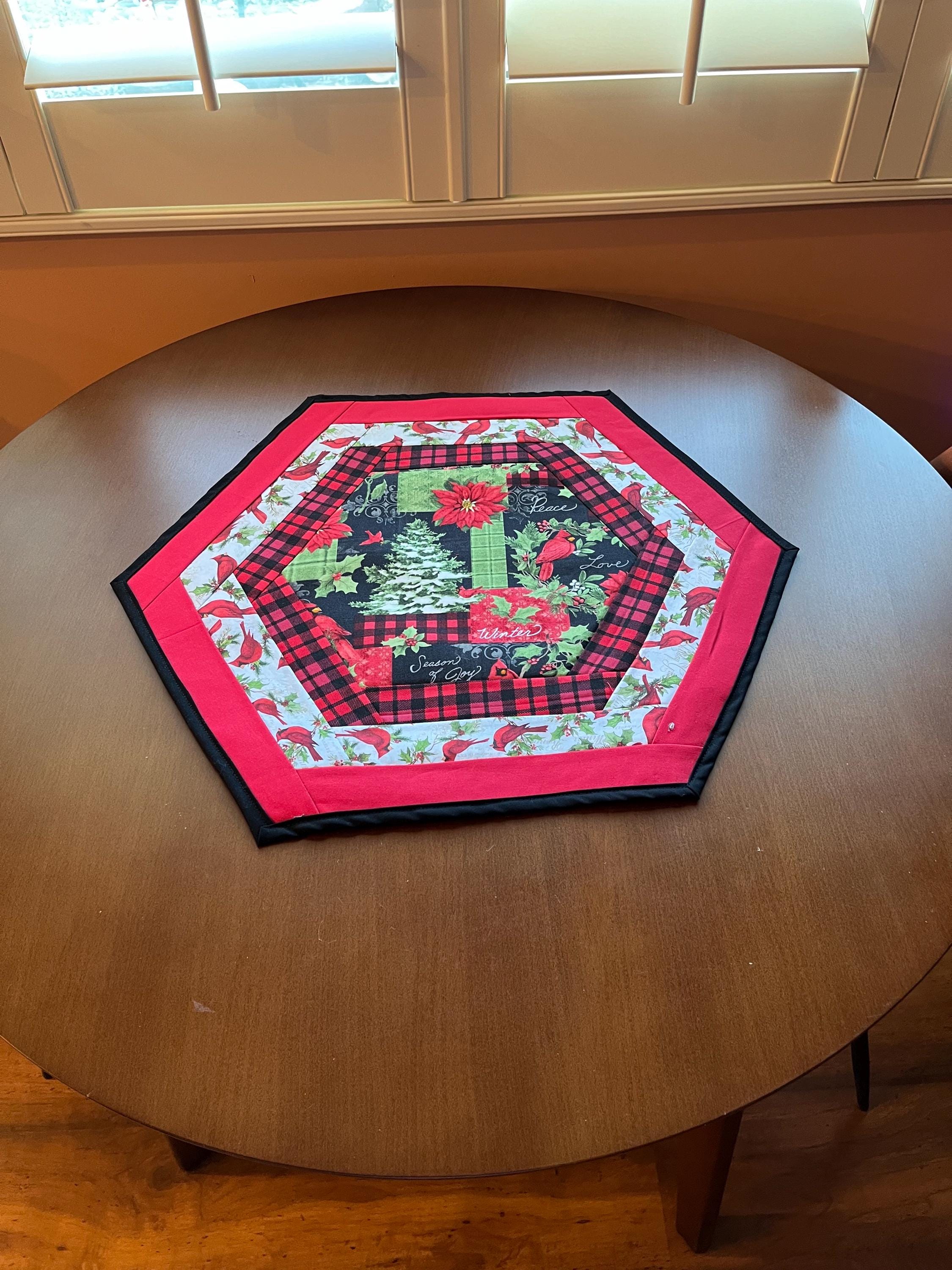 This festive Christmas table topper is perfect for your round or hexagon tables. Handmade and quilted by me. The topper measures 18 “ X 18”.