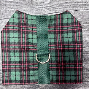 Your pup will be styling in this fun harness vest. This very stylish & comfy Handmade Dog Harness Vest is made of the softest quality cotton lining and cotton exterior. It features a wrap around collar and D Ring. Fastens with velcro at neck and under belly. This harness is also suitable for cats. These harnesses are designed for smaller dogs.