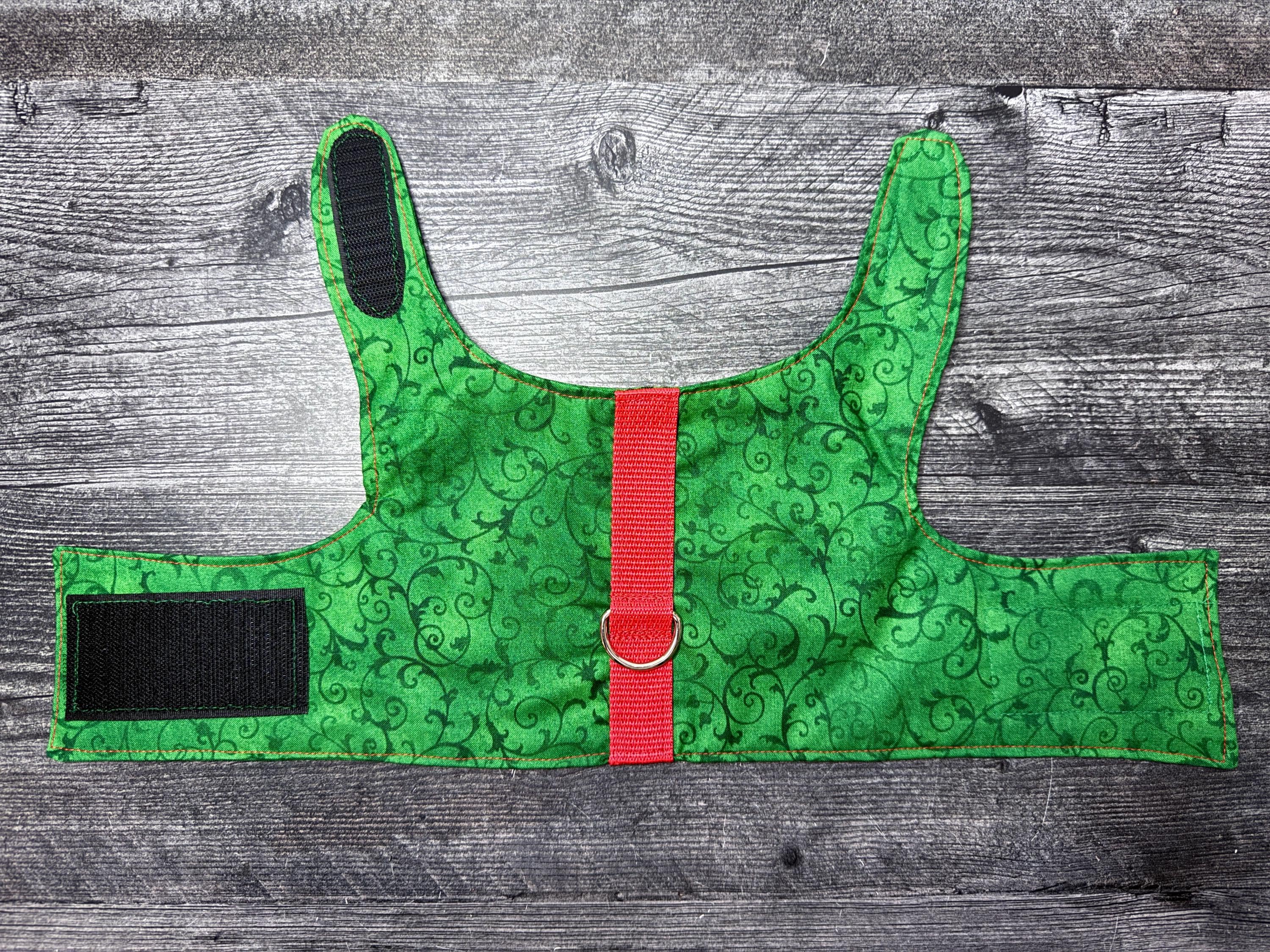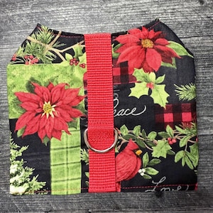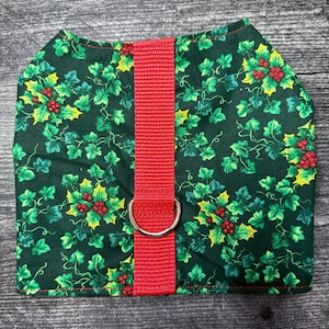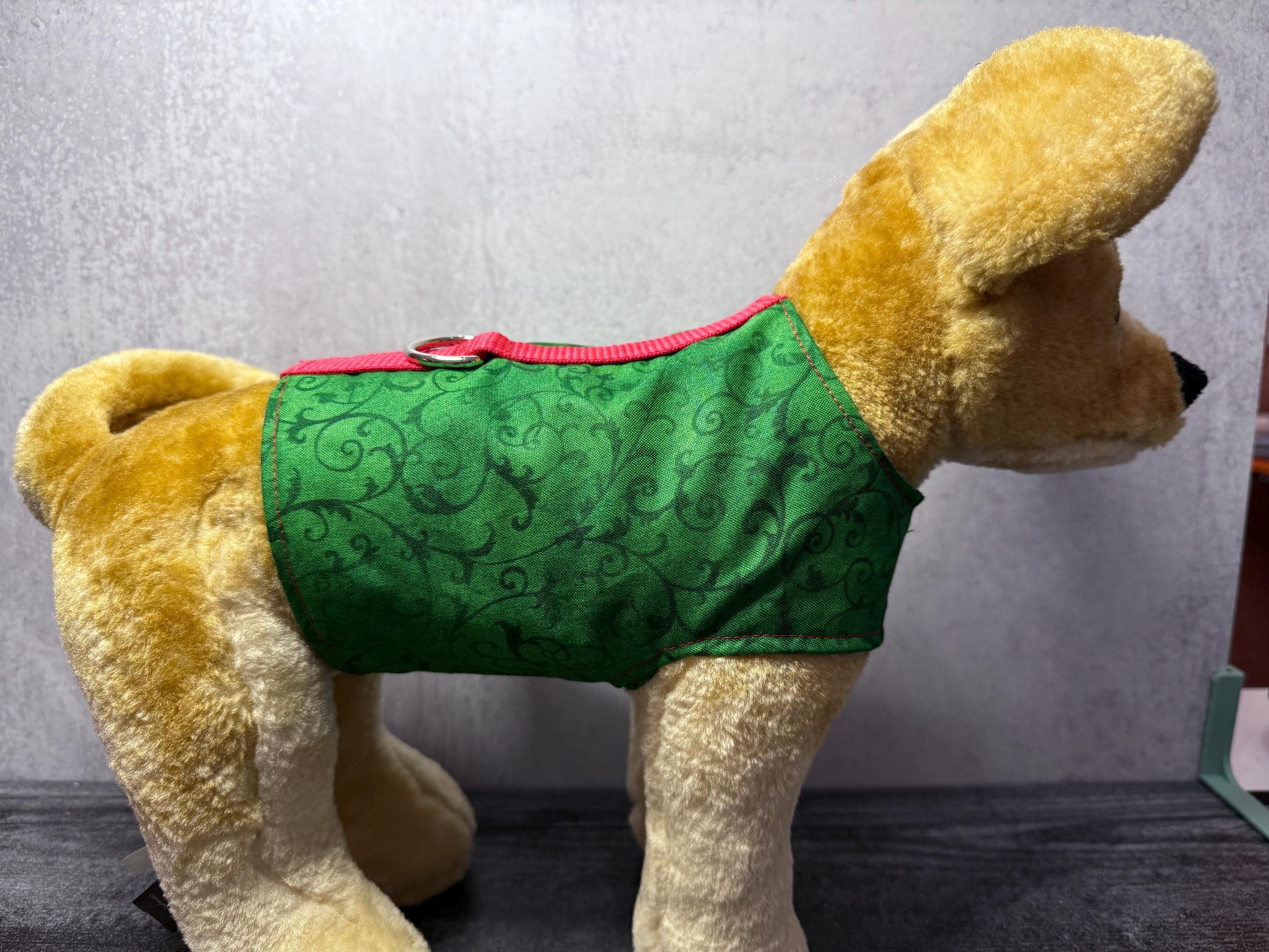 Your pup will be styling in this fun harness vest. This very stylish & comfy Handmade Dog Harness Vest is made of the softest quality cotton lining and cotton exterior. It features a wrap around collar and D Ring. Fastens with velcro at neck and under belly. This harness is also suitable for cats. These harnesses are designed for smaller dogs.