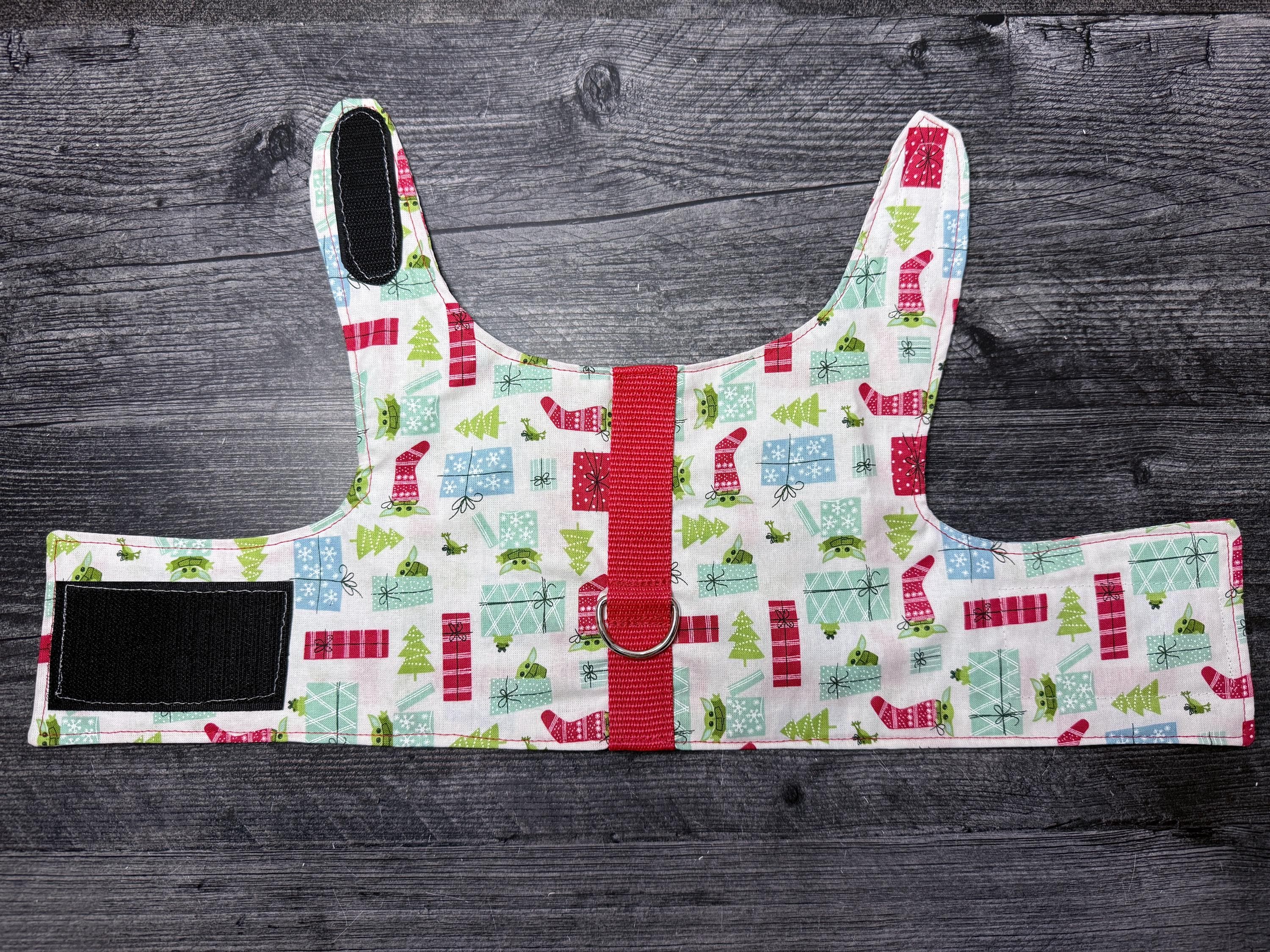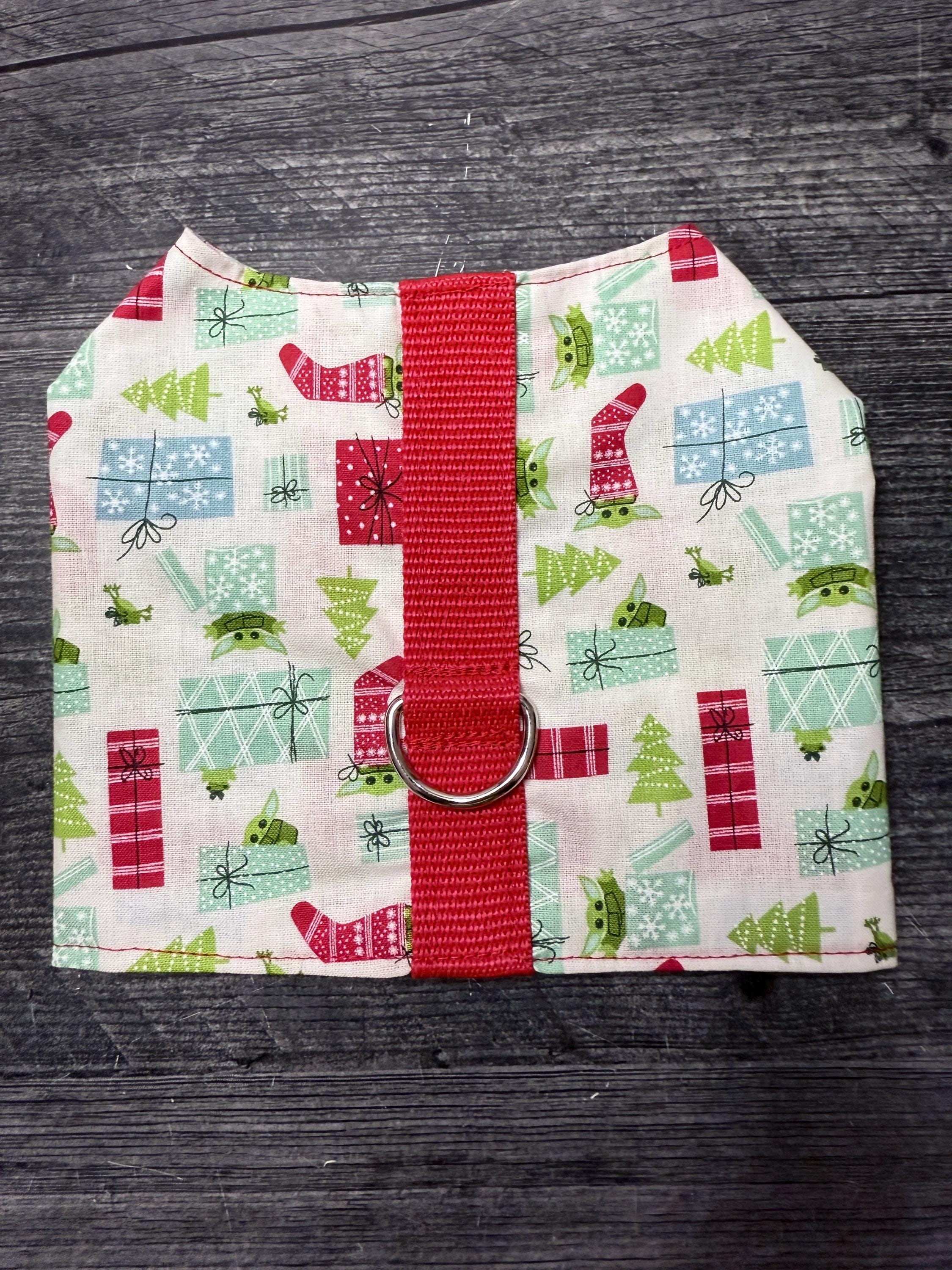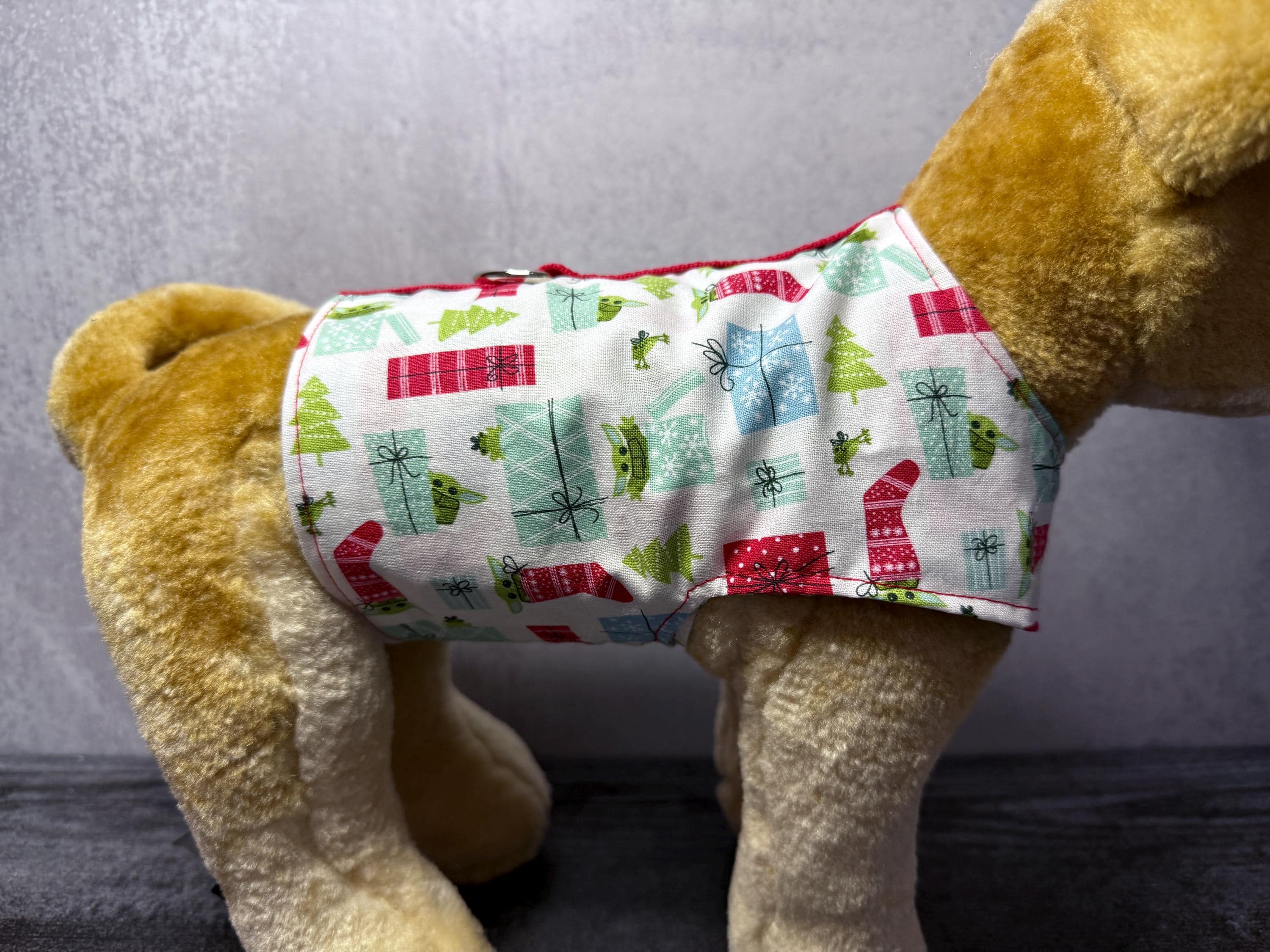 Your pup will be styling in this fun harness vest. This very stylish & comfy Handmade Dog Harness Vest is made of the softest quality cotton lining and cotton exterior. It features a wrap around collar and D Ring. Fastens with velcro at neck and under belly. This harness is also suitable for cats. These harnesses are designed for smaller dogs.