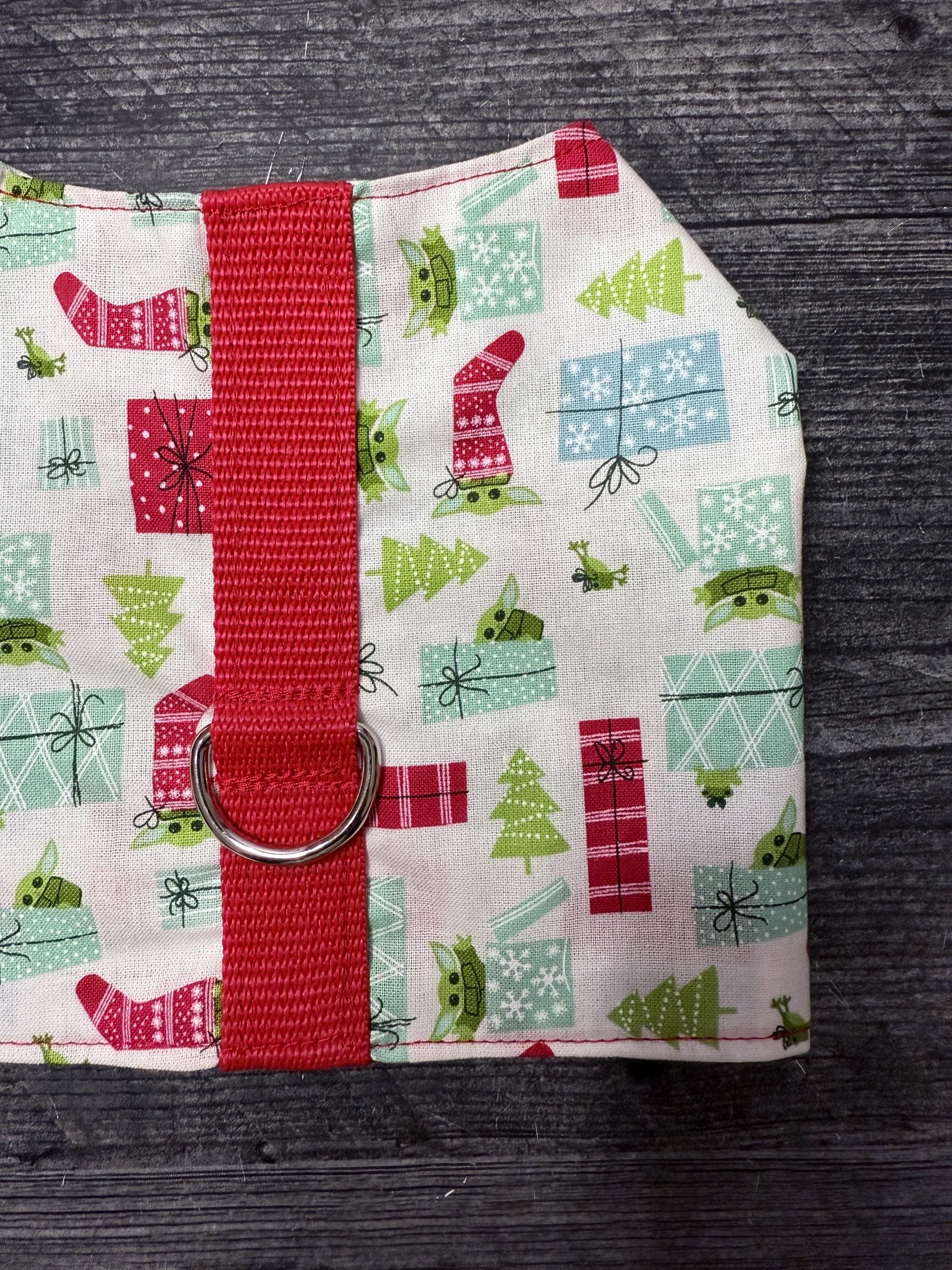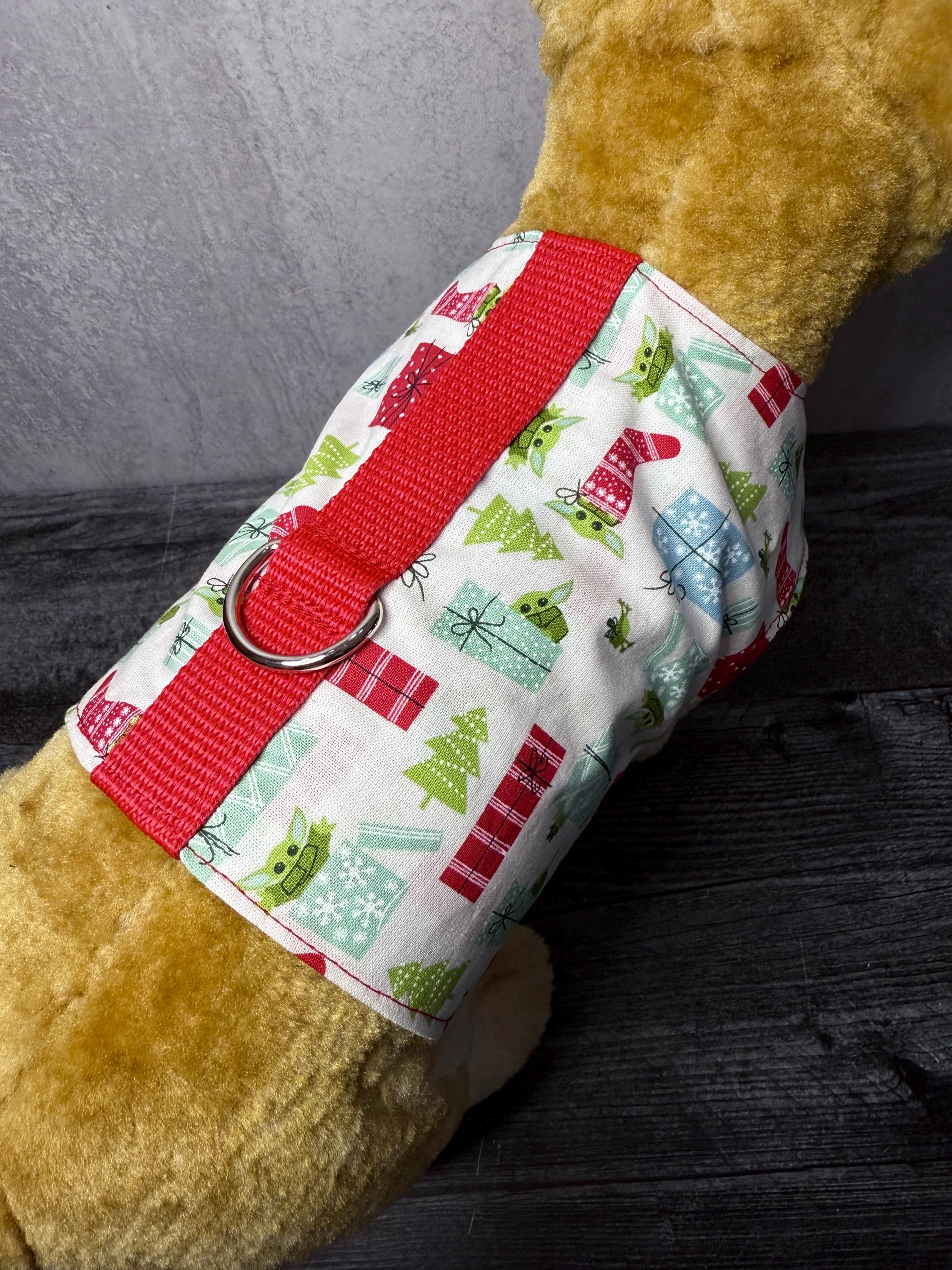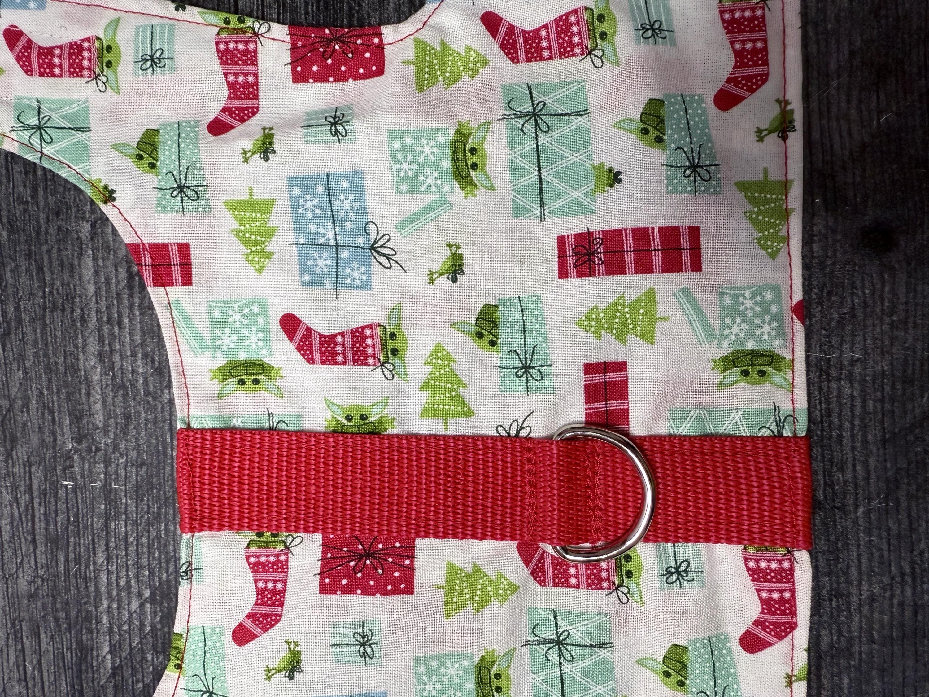 Your pup will be styling in this fun harness vest. This very stylish & comfy Handmade Dog Harness Vest is made of the softest quality cotton lining and cotton exterior. It features a wrap around collar and D Ring. Fastens with velcro at neck and under belly. This harness is also suitable for cats. These harnesses are designed for smaller dogs.